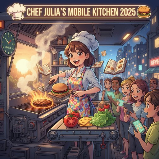 Step into the vibrant world of Chef Julia's Mobile Kitchen, where your skills as a culinary wizard are put to the test every day. Chef Julia has built her reputation on serving the best burgers in town, and she needs your help to keep her reputation intact. You'll find yourself bustling through the kitchen, from the breakfast rush until the evening's last customer. Each day brings new challenges, from surprise ingredients to time constraints, but also new recipes and special orders. With each delicious burger you serve, Chef Julia's business will grow, allowing you to access more ingredients and special ingredients. Stay on top of your game, or face the wrath of impatient customers and loss of tips. Can you become the master chef Julia needs?